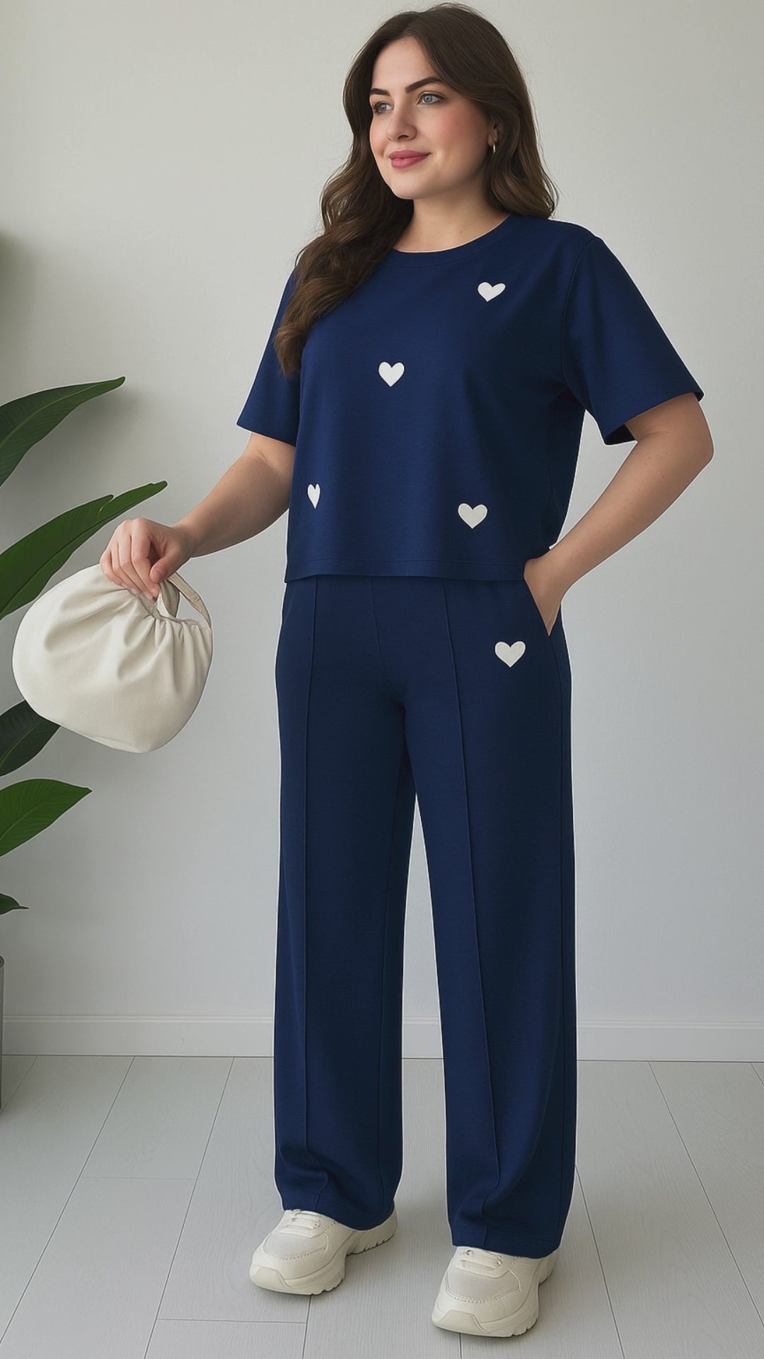 ❤️ Adorable heart‑printed top for a fun, youthful look 🧵 Soft, breathable fabric ideal for summer 👖 Straight trousers for a sleek, relaxed silhouette 💫 Perfect for casual outings, home wear, travel & daily comfort